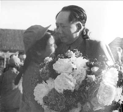 這位女文工團(tuán)員給毛澤東獻(xiàn)上鮮花、握手后,突然撲到毛澤東懷里,緊緊擁抱著,情不自禁地淚流滿面。那一刻,在場的所有人全愣住了。被打動的毛澤東閉上眼睛,旁邊的呂厚民立即反應(yīng)過來,按動快門,把這一感人的場面拍了下來。