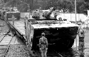 離幾名照相的戰(zhàn)士不遠(yuǎn),一輛準(zhǔn)備離開的受閱戰(zhàn)車上,一名隊員站在導(dǎo)彈發(fā)射架頂端,右手的抹布使勁擦拭著裝備。擦完,仔細(xì)看看,再擦。不遠(yuǎn)處,幾名隊員正在平板火車上固定裝備。