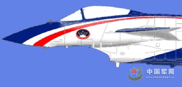 殲-10表演隊的隊徽采用兩個鑲嵌的橢圓,中間是6架戰(zhàn)鷹,在兩個橢圓之間下部噴涂“空軍八一飛行表演隊”字樣。 隊徽顏色采用紅、黃、藍(lán)、白四種顏色。噴涂在機頭左右兩側(cè),共2處(見圖12、13)。