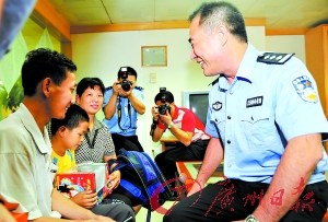 昨日下午1時20分,東莞市公安局一樓大堂,兩位民警牽著一個少年的手走向電梯!暗葧䞍阂姷侥愀改,一定要叫‘爸爸媽媽’,知道不?”警察叮囑少年說!拔也唤校褪遣唤。”少年扭著頭隨著民警走進(jìn)了電梯。