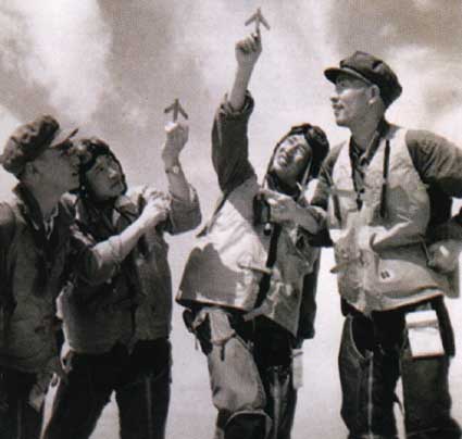 “01,敵F-4兩架侵入我國領(lǐng)空,已被我高炮部隊(duì)擊落一架,另一架正在你右前方二十五公里,繼續(xù)向我境內(nèi)飛行。航向一百六十度、高度二千米、速度一千公里,準(zhǔn)備戰(zhàn)斗!钡孛嬷笓]員向飛行員發(fā)出了命令。宋義民立即指揮戰(zhàn)友調(diào)整空中戰(zhàn)斗隊(duì)形,組織搜索警戒。情況顯示板上、熒光屏上敵機(jī)的航跡在不斷地向我境內(nèi)延伸。突然,二號機(jī)趙廣江大聲報告“右前方發(fā)現(xiàn)一架敵機(jī)!敝笓]員拿起話筒:“跟上去,狠狠打!”隨即一號機(jī)、三號機(jī)、四號機(jī)都發(fā)現(xiàn)了目標(biāo),在長機(jī)宋義民的指揮下,三架飛機(jī)加大油門一齊向敵機(jī)撲去。