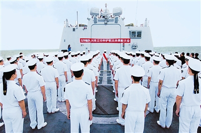 綬帶映紅碧波,掌聲響徹大洋。今天(當(dāng)?shù)貢r間11月25日)下午4時,中國海軍第三批護(hù)航編隊“火線立功和護(hù)航尖兵表彰大會”在“舟山”艦飛行甲板舉行。