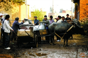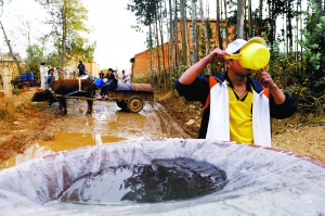 芳華鎮(zhèn)雙合村口,朱家付牽著牛車擠在人群中。黃牛拉著一個銹跡斑斑的鐵桶,那是全家用水的希望。抽上來的水不時的灑到人們身上,孩子們嬉笑著。