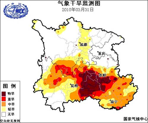 中央氣象臺預(yù)計(jì),未來十天,西南氣象干旱區(qū)無強(qiáng)降雨過程,大部分旱區(qū)旱情仍將持續(xù)。4月1日至4月2日,西南氣象干旱區(qū)有弱的降雨,降雨量普遍不足3毫米;貴州北部和東部有5~20毫米降雨。4月7日前后,貴州、廣西西北部有陣性降雨,降雨量有3~5毫米。具體預(yù)報(bào)如下: