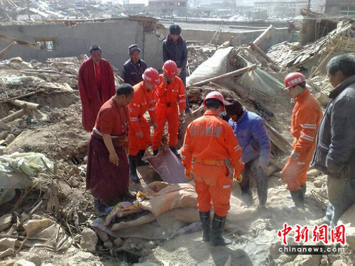 15日上午7時(shí)許,接到玉樹州新建北路261號(hào)藏族同胞曲究文碩的報(bào)告,稱其房屋倒塌,內(nèi)有5人被埋,生死不明,請(qǐng)求救援。接到求救信號(hào)后,什邡救援隊(duì)立即兵分兩路,一路在民族職業(yè)中學(xué)繼續(xù)施救,另一路立即趕往曲究文碩的住所進(jìn)行救援。到了曲究文碩住所,這里的房屋幾乎全部倒塌,整個(gè)居民區(qū)被移為平地。什邡救援隊(duì)隊(duì)員一刻也不停地展開地毯式搜索。