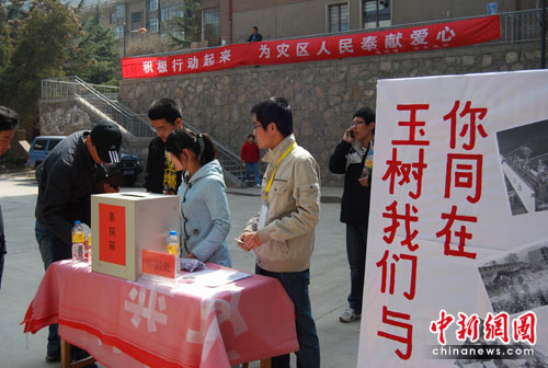 記者看到,校園內(nèi)的各個(gè)捐助點(diǎn)都張貼著玉樹地震后的現(xiàn)場(chǎng)黑白圖片,每一位過往的學(xué)生都駐足凝視,被照片里的情景深深震撼。