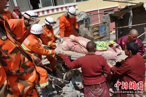 中新網(wǎng)成都4月17日電(肖洪環(huán))4月16日,玉樹(shù)7.1級(jí)地震救援進(jìn)入第三天,也是“黃金72小時(shí)”的關(guān)鍵時(shí)機(jī),四川消防鐵軍官兵按照溫家寶總理的指示,堅(jiān)持“救人第一”的原則,利用生命探測(cè)儀、搜救犬和“喊、聽(tīng)、問(wèn)、看”等方式在廢墟下努力搜尋幸存者,不放過(guò)任何一個(gè)角落,不放棄任何一絲希望,全力以赴救援,展開(kāi)了生命大營(yíng)救,尤其是在縣城扎西巷一個(gè)居民樓救援現(xiàn)場(chǎng)發(fā)生的那一幕幕感人致深的場(chǎng)景,讓人們繼“5.12”以來(lái)再一次次地感受到人間最偉大的“母愛(ài)”,以及救援人員對(duì)生命、對(duì)逝者、對(duì)民族的尊重,在難救援現(xiàn)場(chǎng)處處彰顯出“災(zāi)難無(wú)情、人間有情”的“大愛(ài)”。