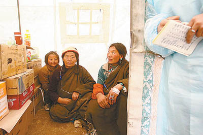 看一看玉樹街頭的人們,你會五味雜陳。傷感無處不在:小學生的校服和紅領巾上沾著灰,好像是剛從倒塌的校舍里拋出來的一樣;9歲的孩子抱著爛了一半的梨子不肯撒手;革及著拖鞋的外地女人失神地站在消失了的貨棧面前。但也有些時候,能遇上剛領了一把掛面的女孩笑呵呵地露出白色牙齒,或是孩子在蓬頭垢面的母親懷里安睡。一個孤獨的老婦人牽著一條狗,面色平靜地坐在倒掉的院墻邊上,讓人不禁想起“家園”和“守候”這些詞匯。