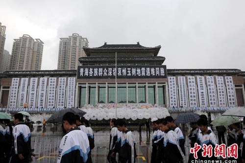 中新網(wǎng)4月21日電 國旗升至半空,汽車、火車、輪船鳴笛,防空警報鳴響……今日,雪中的青海省會西寧籠罩在悲慟的氣氛之中。上午10時,西寧地區(qū)各族、各界群眾參加的悼念大會在新寧廣場舉行。各界群眾為在玉樹地震中遇難的同胞默哀三分鐘。