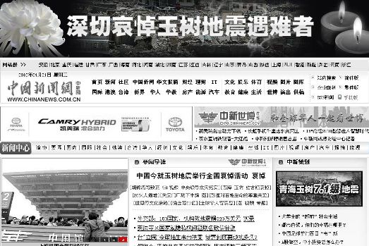 中新社廣州4月21日電 (張乾鑠)21日凌晨零時起,中國最具影響力的新聞網(wǎng)站人民網(wǎng)、新華網(wǎng)、中國新聞網(wǎng)等各大網(wǎng)站主頁頁面全部變?yōu)榛疑,這是中國互聯(lián)網(wǎng)界的統(tǒng)一行動:為青海玉樹地震中遇難的同胞志哀,為玉樹人民祈福。