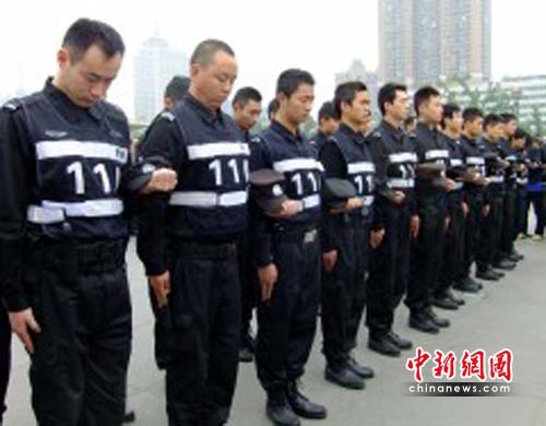今晨,成都的上空被陰云籠罩,陰沉沉灰蒙蒙的天空使整座城市都沉浸在哀悼的氛圍當(dāng)中。上午10點(diǎn)許,成都市公安局青羊分局巡警大隊(duì)二十余名干警邁著整齊的步伐來(lái)到天府廣場(chǎng),面對(duì)降下的半旗,向在這次地震中遇難的藏族同胞們默哀三分鐘。不少市民紛紛前往向遇難同胞默哀。