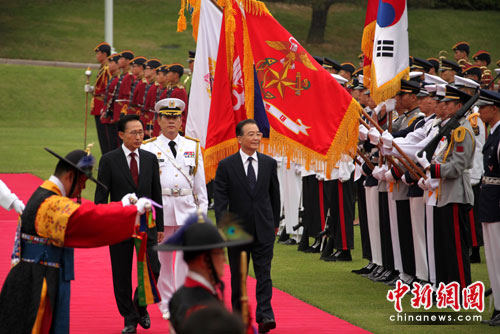 會(huì)談前,李明博為溫家寶舉行了歡迎儀式。