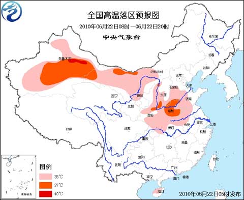 中央氣象臺2010年6月22日06時繼續(xù)發(fā)布高溫藍色預(yù)警: