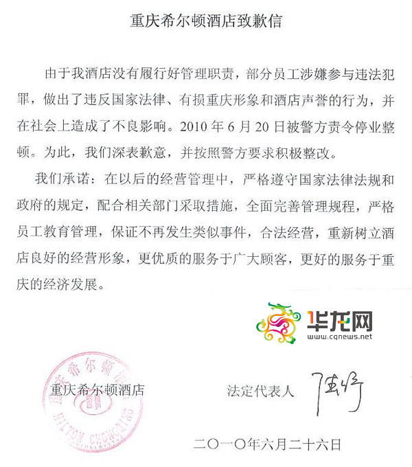 2010年6月20日,重慶希爾頓酒店因股東涉黑,介紹、容留婦女賣淫,違法經(jīng)營和故意擾亂社會秩序,被重慶警方責(zé)令停業(yè)整頓。今日16時40分,重慶希爾頓酒店法定代表人陸紓,通過華龍網(wǎng)記者就此事公開發(fā)表致歉信,承諾合法經(jīng)營,更好地服務(wù)重慶經(jīng)濟發(fā)展。