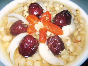 取薏仁米50g、百合15g、粳米100g、蜂蜜適量。將薏仁米、百合、粳米入鍋加水煮至熟爛,入蜂蜜調勻,出鍋即成。分2次服完。此粥有健脾益胃,澤膚祛斑功效?捎糜谥委煁D女面部雀斑、痤瘡、濕疹等癥,對癰腫、濕瘡有治療效果。