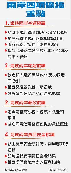 報(bào)道說(shuō),兩會(huì)副董事長(zhǎng)、副會(huì)長(zhǎng)層級(jí)協(xié)商昨天敲定空運(yùn)、海運(yùn)、郵件及食品安全等四項(xiàng)協(xié)議,今天將由;鶗(huì)董事長(zhǎng)江丙坤及海協(xié)會(huì)會(huì)長(zhǎng)陳云林舉行二次江陳會(huì)談,簽署協(xié)議。其中空運(yùn)、海運(yùn)、郵件等三項(xiàng)協(xié)議在簽署四十天后生效,食品安全協(xié)議在七天后生效。