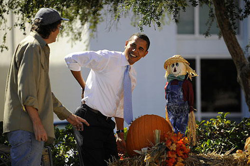 10月30日,在美國(guó)佛羅里達(dá)州的薩拉索塔,選戰(zhàn)中四處奔走的美國(guó)民主黨總統(tǒng)候選人奧巴馬忙里偷閑,來(lái)到當(dāng)?shù)氐囊患夷瞎蠄@摘南瓜,享受片刻悠閑。
