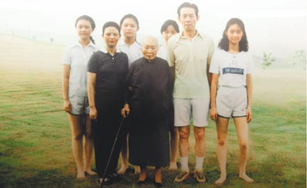 一九八一年王永慶(右二),與母親王詹樣(右三)在長(zhǎng)庚球場(chǎng)合照,身邊還有夫人李寶珠(左二)和四個(gè)千金。聯(lián)合報(bào)系資料照片