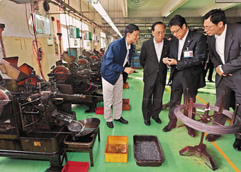 曾蔭權(quán)12日與香港5大商會代表舉行早餐會,聽取他們對企業(yè)方面的意見,下午即前往東莞實地考察當(dāng)?shù)馗凵痰那闆r。他在東莞市長李毓全的陪同下,先到東莞鳳崗鎮(zhèn)一間五金制品廠參觀,該港資企業(yè)于1977年成立,聘有千多名員工,接著與約20名珠三角港資企業(yè)代表舉行座談會,進一步了解他們現(xiàn)時面對的營運困難。返回香港后,他于傍晚舉行記者會。