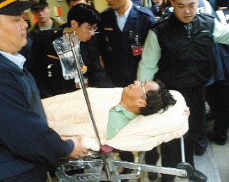警方層層保護(hù),避免讓躺在推床上的陳水扁曝光。圖片來(lái)源:臺(tái)灣《聯(lián)合報(bào)》