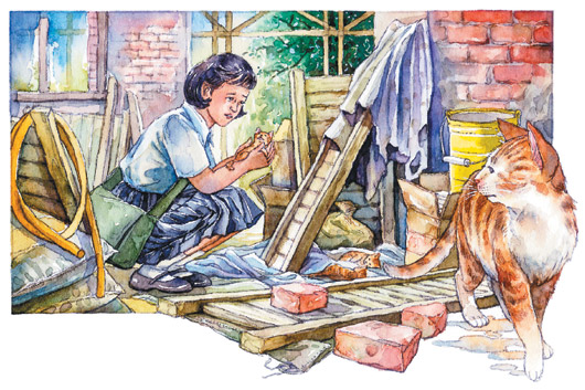 那天一放學(xué),我迫不及待的帶著我的狗,到夢(mèng)里出現(xiàn)的工地,結(jié)果真的在一間空屋角落,發(fā)現(xiàn)三只小貓,它們跟母老虎一樣,都是虎斑紋的毛,可惜其中兩只已經(jīng)死了。