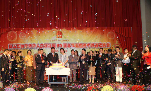 中新網(wǎng)9月20日電 據(jù)非洲《華僑周報》報道,16日,中國駐博茨瓦納大使館與旅博僑團在首都哈博羅內(nèi)聯(lián)合舉行慶祝中國成立60周年暨迎中秋晚會。駐博大使劉煥興、經(jīng)商參贊宮和平、博茨瓦納中國和平統(tǒng)一促進會會長喬良、博茨瓦納華商總會會長劉冰、博茨瓦納-中國友好協(xié)會執(zhí)行主席南庚戌以及福建同鄉(xiāng)會、江西同鄉(xiāng)會、馬翁僑社、中資企業(yè)協(xié)會等組織及僑胞代表共300余人歡聚一堂,共慶偉大祖國60周年華誕,共迎中秋傳統(tǒng)佳節(jié)。
