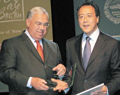 中新網(wǎng)10月9日電 據(jù)美國(guó)《世界日?qǐng)?bào)》報(bào)道,美國(guó)波士頓一年一度慶祝新移民和多元文化的慶典宴會(huì)“我們就是波士頓”(We are Boston),6日晚假波士頓會(huì)議中心舉行,900多名與會(huì)者向獲頒2009年度領(lǐng)袖獎(jiǎng)的華裔大提琴家馬友友致敬。