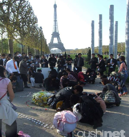 數(shù)百名在法留學(xué)生和華人于18日在巴黎艾爾菲鐵塔前的和平墻點(diǎn)起蠟燭,為青海玉樹(shù)地震的遇難者祈福。他們將數(shù)百支蠟燭擺成巨大的心形和“玉樹(shù)”字樣,然后逐一將蠟燭點(diǎn)燃,與此同時(shí),祈福板上也留下他們各式的祝福語(yǔ),表達(dá)自己對(duì)災(zāi)區(qū)同胞們血脈相連的感情。望著燃燒的蠟燭,留學(xué)生和華人高呼“玉樹(shù)加油”,衷心的祈求青海玉樹(shù)地震中的生者平安,死者安息。活動(dòng)吸引不少路過(guò)的法國(guó)人和游人也停下腳步,為玉樹(shù)地震的死難者哀悼。