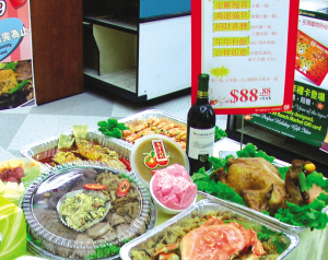 經(jīng)濟(jì)不好,團(tuán)年飯改在家里吃吧!大華超市公關(guān)經(jīng)理曹其崢表示,他們根據(jù)市場的判斷,認(rèn)為許多華裔人士會追求經(jīng)濟(jì)實惠的家庭套餐,如果可以讓他們在家里就可以座享餐館的美食,將會受歡迎。因此,他們推出了力求薄利多銷,“百元有找”的新春套餐。新春套餐以“金雞報喜”、“鴻運(yùn)滿堂”、“招財進(jìn)寶”、“年年有余”等吉祥話命名,包括全雞、大蝦、肉蟹、黃金魚及魯菜拼盤,另外贈送紅酒、水果盤、發(fā)糕及年糕,全部套餐只要88.88元。