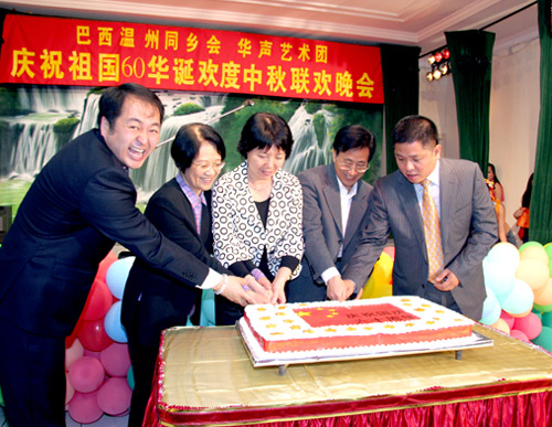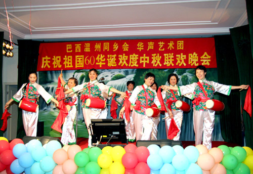 中新網(wǎng)9月21日電 據(jù)巴西南美僑報/巴西僑網(wǎng)報道,巴西溫州同鄉(xiāng)會與華聲藝術團慶祝祖國60華誕歡度中秋節(jié)聯(lián)歡晚會19日晚在溫州同鄉(xiāng)會會館舉行,中國駐圣保羅總領事孫榮茂夫婦以與數(shù)百僑胞歡聚一堂,度過一個熱烈歡欣的夜晚。