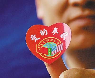 福建公所主席鄭時甘在東百老匯的募捐攤位上向每位捐款的民眾贈送一張印有“愛的奉獻(xiàn)”字樣和福建公所標(biāo)志的紅色心型貼紙,一方面表示對捐款者的感謝,一方面希望僑胞能將貼紙傳遞給更多華人,使更多民眾為青海災(zāi)區(qū)獻(xiàn)上愛心。