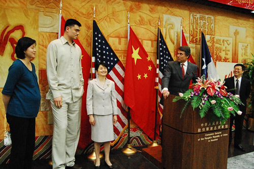 中新網(wǎng)4月28日電 據(jù)美國《美中信使報(bào)》報(bào)道,中國駐休斯頓總領(lǐng)事高燕平與美國德克薩斯州州長里克.佩里于當(dāng)?shù)貢r間27日下午5時在總領(lǐng)館會議大廳舉辦“慶祝上海世博會和中國-得州友好關(guān)系”招待會。擔(dān)任上海世博會形象大使的中國著名籃球明星姚明和他的妻子葉莉以及當(dāng)?shù)厝A人僑領(lǐng)及學(xué)界代表200余人應(yīng)邀出席招待會。