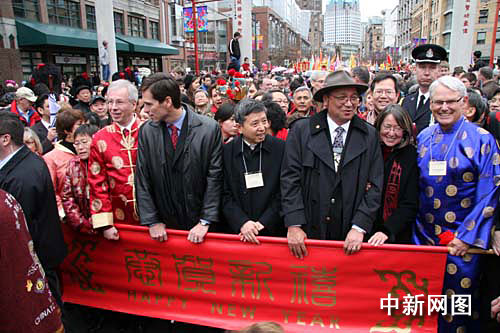 隨著震天的鑼鼓聲、鞭炮聲、大人小孩歡樂的笑聲,“財神爺”身著大紅袍,頭戴金盔,手舉護身旗走在游行隊伍最前面。在南腔北調(diào)的“恭喜發(fā)財”聲中,新上任不久的卑詩省省督波因特沿途向民眾大派“利是”;加拿大最大反對黨聯(lián)邦自由黨黨領(lǐng)狄安身穿紅色唐裝,頻頻拱手賀禧;中國駐溫哥華總領(lǐng)事楊強,卑詩省省長金寶爾和溫哥華市長蘇利文等加國三級政要并排而行,拉著寫滿新春祝福的橫幅,與民眾共慶戊子鼠年新春。