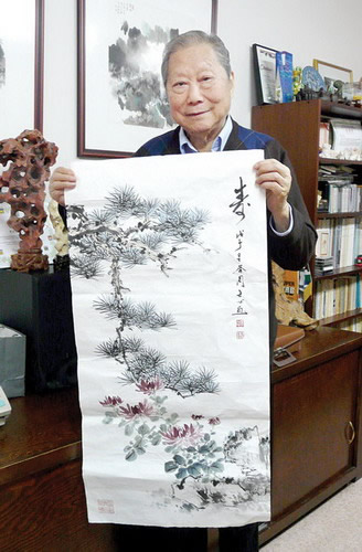 周士心大師為賑災(zāi)而畫(huà)的《壽松》。(加拿大《明報(bào)》)