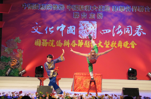 中新網(wǎng)2月25日電 由國(guó)務(wù)院僑辦和中國(guó)海外交流協(xié)會(huì)組派的“文化中國(guó)·四海同春”2010年春節(jié)赴菲律賓藝術(shù)小組在宿務(wù)進(jìn)行了精彩的演出。濃郁的民俗文化氣息,精湛的演藝水平,受到了當(dāng)?shù)貎S胞的極大贊譽(yù)。