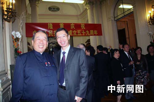 是晚的中國(guó)駐法使館內(nèi)張燈結(jié)彩,一派喜氣;走廊里布置的北京國(guó)家體育場(chǎng)——鳥(niǎo)巢掩映在璀璨的禮花中,分外奪目;旅法華人社團(tuán)向祖(籍)國(guó)祝賀生日的花籃從使館大門口排到了二樓。身著中式禮服的中國(guó)駐法大使與僑胞們同賀祖(籍)國(guó)59華誕。