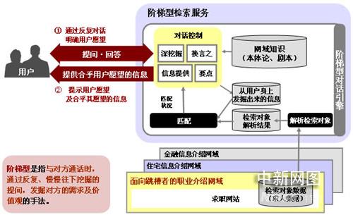 沖電氣與RECRUIT,共同開(kāi)發(fā)設(shè)計(jì)了通過(guò)計(jì)算機(jī)向用戶提問(wèn),發(fā)掘用戶獨(dú)自無(wú)法表達(dá)的愿望及需求,從各種各樣大量的服務(wù)及內(nèi)容中找出與之匹配信息的“階梯型檢索服務(wù)”。去年本服務(wù)已經(jīng)被“信息大航海項(xiàng)目”作為模型服務(wù)之一所采納,進(jìn)行了圍繞階梯型對(duì)話引擎的系統(tǒng)技術(shù)開(kāi)發(fā),在以約800用戶為對(duì)象的向跳槽者介紹職業(yè)的網(wǎng)域進(jìn)行了驗(yàn)證試驗(yàn)。結(jié)果表明,與用戶平均進(jìn)行了33次對(duì)話(系統(tǒng)提問(wèn),用戶回答后算一次對(duì)話),可以平均從用戶獲得32個(gè)屬性的信息。同時(shí)進(jìn)行了問(wèn)卷調(diào)查,24%的用戶回答通過(guò)對(duì)話得到了提示,了解了自己的需求,驗(yàn)證了通過(guò)與計(jì)算機(jī)對(duì)話,能發(fā)掘用戶自身沒(méi)有注意的需求。而且,沖電氣還從中獲知可以對(duì)該服務(wù)寄予極大期望,期待目前有54%,兩年后有75%的用戶能使用該服務(wù)。
