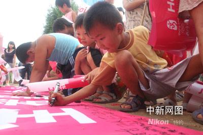 在校長的組織下,沉浸在興奮中的孩子們爭先恐后的來到祝福橫幅前為奧運、為中國健兒祝福。在良久思索之后,一個小男孩兒半跪在地上,先用彩筆寫下大大的“加油”兩字,然后又在“加油”下面畫了一個太陽,一間房子、一只小鳥,最后認認真真的簽上自己的名字:孫衛(wèi)彬。孫衛(wèi)彬說:“太陽代表希望和海爾叔叔阿姨們的關(guān)心,房子是教室,小鳥就是我和同學們!