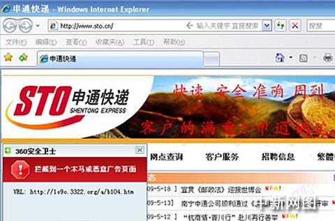 中新網5月21日電 5月19日,360安全中心監(jiān)測到國內知名物流公司申通快遞的官方網站首頁被黑客“掛馬”。大量經常登陸申通官網進行快件查詢的用戶,如果電腦中存在軟件漏洞,就會被植入惡意代碼,面臨淪為“肉雞”的威脅。截至5月20日上午,申通官網首頁此次的“掛馬”已經被清除。