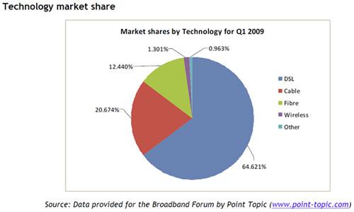 按技術(shù)劃分,DSL仍是主流寬帶技術(shù),市場(chǎng)份額為64%。其次為線纜(有線電視)接入,市場(chǎng)份額為20%。光纖排名第三,市場(chǎng)份額為12%。