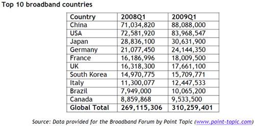 報(bào)告顯示,今年第一季度全球新增1660萬條寬帶線路,使總線路達(dá)到4.292億條。其中,中國(guó)寬帶線路為8808萬條,排名首位。美國(guó)為8396萬條,位居第二。日本為3063萬條,排名第三。第四至第十位排名依次為德國(guó)、法國(guó)、英國(guó)、韓國(guó)、意大利、巴西和加拿大。