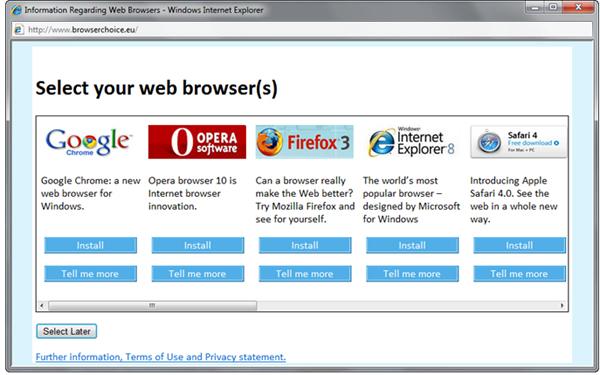根據(jù)微軟和歐盟達成的協(xié)議,微軟同意在Windows 7中捆綁IE瀏覽器的同時,還提供其他瀏覽器安裝選項,而這些瀏覽器的排列順序是隨機的。