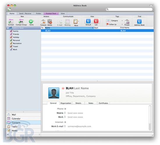 與微軟Office 2010的外觀非常相似,Office 2011 for Mac在一個(gè)應(yīng)用程序上都包括這個(gè)絲帶。這是微軟首次在用于Mac機(jī)的Office套裝軟件中提供Outlook程序。用于Windows和Mac機(jī)的Outlook軟件的外觀是一樣的,包括郵件預(yù)覽框、日歷、聯(lián)絡(luò)人、任務(wù)和備注等。