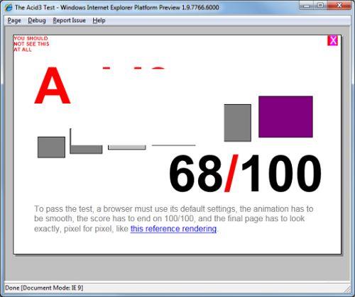 同時(shí),微軟還提供了IE9第二預(yù)覽版的一些測試結(jié)果。在Acid 3測試中,新版瀏覽器得到了68分,高于首個(gè)版本。