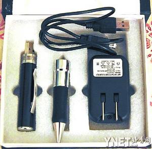 在談好280元的價格后,店主從柜臺的角落里拿出了一個上鎖的黑包,打開后從里面拿出了一個黑色的盒子,上寫英文“MP9 Digital Pocket Video Recorder”(MP9數(shù)字口袋攝像機)。整套產(chǎn)品由四部分構成:筆頭、筆桿、充電器和USB線。該筆外形與一般的圓珠筆相差不大,其中筆桿為“偷拍筆”的核心部分,筆桿的頂端有一個開關按鈕,筆夾的上方有一個針眼攝像頭,筆桿背面有兩個小孔,上方小孔是指示燈,下方為收音孔。筆桿最下端有一個USB的接口,起到傳輸畫面的作用。據(jù)店主介紹,筆桿里面還有一個U盤存儲器,大小由2G到8G不等。