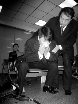 黃靜的代理人周成宇和代理律師付占平一起來到朝陽法院,向法院遞交向華碩討名譽(yù)權(quán)索賠100萬的立案申請,在排號機(jī)上取號后,周成宇與律師進(jìn)入受理大廳等候。就在眾人等待之時(shí),剛才還在與律師交談的周成宇突然口噴鮮血,令大廳內(nèi)的人吃驚不已。有記者遞給周成宇紙巾,擦拭嘴上的血跡,在律師的攙扶下,周成宇坐下,幾次又出現(xiàn)嘔血的狀況。雖然他一直稱沒事,拒絕叫急救車,但臉色蒼白,拿著紙巾的手也不住地顫抖。