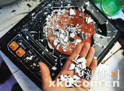 記者來到事發(fā)現(xiàn)場看到,爆炸的電磁爐放在廚房的灶臺上,破碎的磁片散落在電磁爐和地上。電磁爐正上方的抽油煙機(jī)有部分也被炸凹,一個(gè)小鍋掉在地上。在廚房外的墻上和地面,留有斑斑血跡,旁邊的鞋架也倒在地上。
