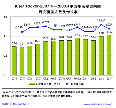 近日,艾瑞咨詢發(fā)布國內首部《中國生活搜索行業(yè)市場研究報告》。報告顯示,截至2008年4月,國內生活搜索覆蓋人群已經(jīng)超過1.03億,較去年同期增幅39%,超過網(wǎng)絡游戲用戶數(shù)量5700萬,已經(jīng)成為中國網(wǎng)民上網(wǎng)的主流應用。