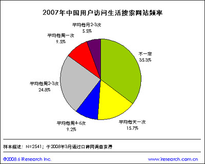 國家工業(yè)和信息化部公布的信息顯示,截至08年2月份,我國網(wǎng)民數(shù)達2.21億人,超過美國居全球首位。而截至2008年4月,國內生活搜索覆蓋人群已經(jīng)超過1.03億,較去年同期增幅39%。在口碑網(wǎng)上完成的對網(wǎng)民調查顯示,約有59.2%的用戶每周至少訪問一次生活搜索網(wǎng)站,查找生活服務商家的信息或發(fā)布相關生活服務需求,其中將近24.9%的用戶幾乎每天都會訪問生活搜索網(wǎng)站,僅有不到4成的用戶沒有確定的訪問習慣。報告認為,正是基于用戶對于本地生活信息的需求促使生活搜索網(wǎng)站的出現(xiàn)。從目前訪問次數(shù)看,生活搜索網(wǎng)站已成為眾多網(wǎng)民日常生活比較依賴的工具之一。