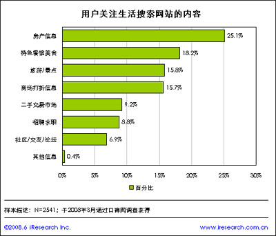 調查數(shù)據(jù)顯示,用戶感興趣的生活服務信息集中在四大類,其中美食占18.20%,旅游占15.83%,商家打折15.66%,房產(chǎn)25.09%,在房產(chǎn)信息中,出售房屋信息關注度最高,占到總整的6.4%,相對而言,其它類似家政、交友、招聘信息關注的程度較小。